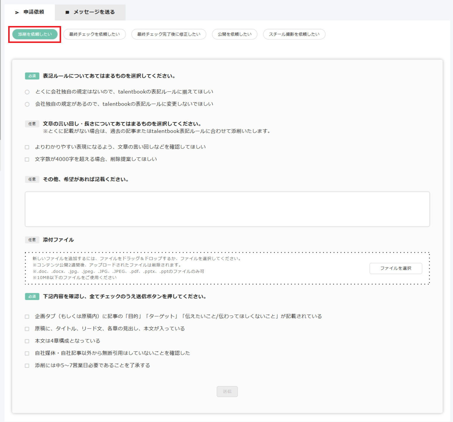 ④「添削を依頼したい」を選択し、執筆した原稿をWordファイルで添付・送信
