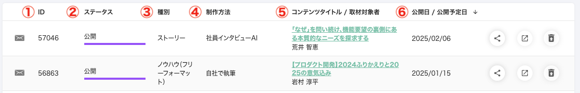 公開済みのコンテンツは公開日を、未公開のコンテンツは設定した公開予定日を表示します。