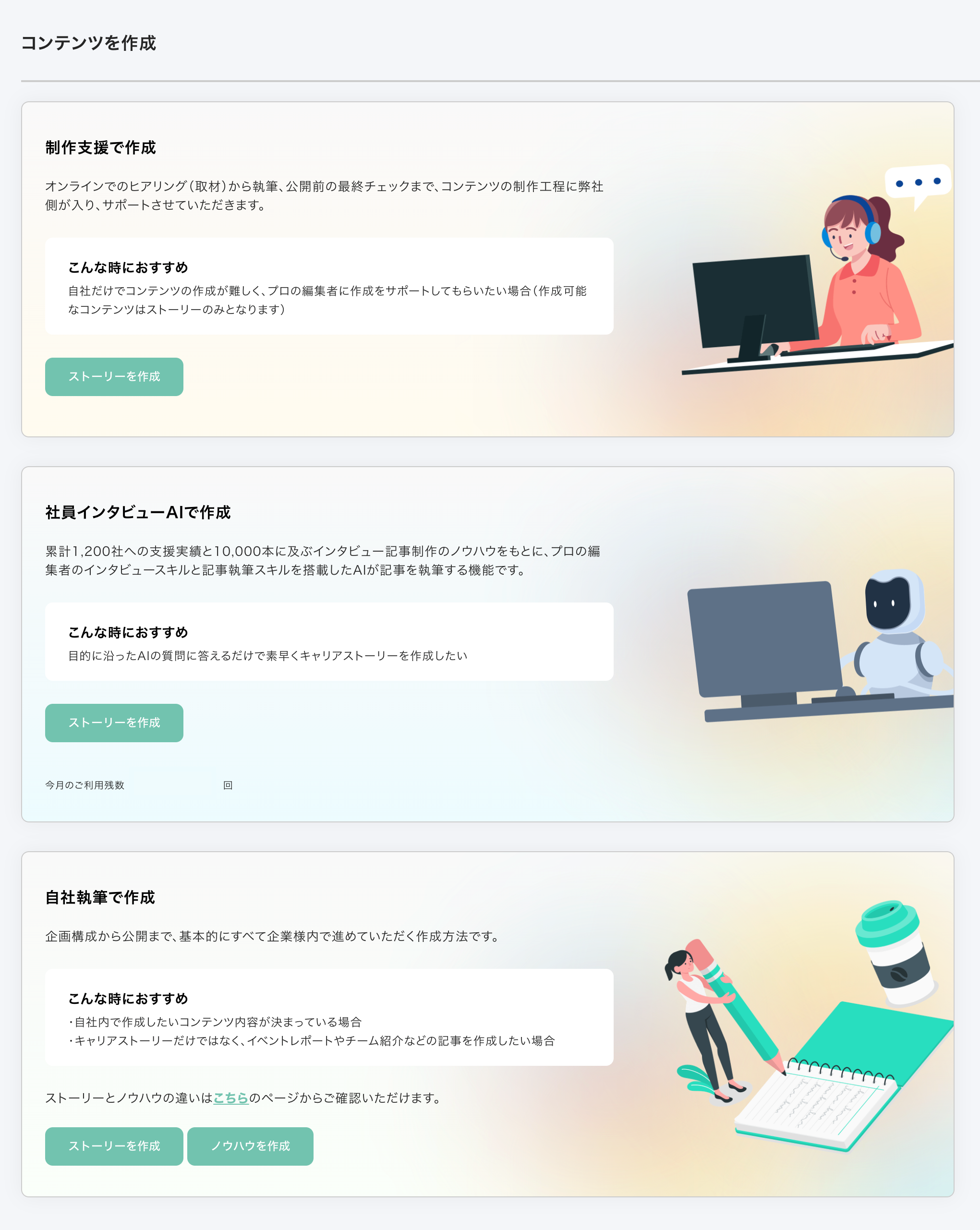 「コンテンツ」ではストーリーやノウハウなどのコンテンツを作成・管理できます。
