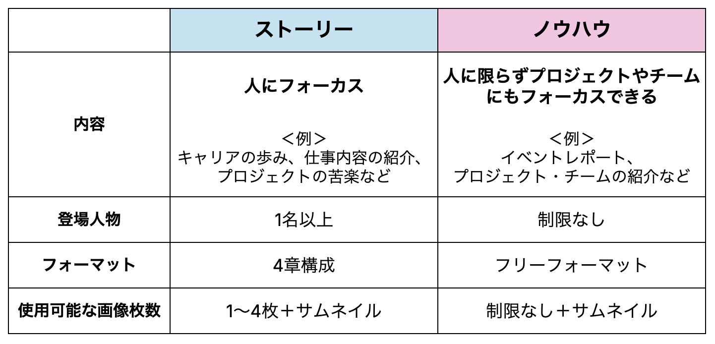 talentbookには「ストーリー」と「ノウハウ(フリーフォーマット)」という2つのフォーマットを用意しています。企画内容やテーマに合わせてフォーマットを選択してください。それぞれの詳細については下記をご参照ください。↪︎ストーリーとは↪︎ノウハウとは