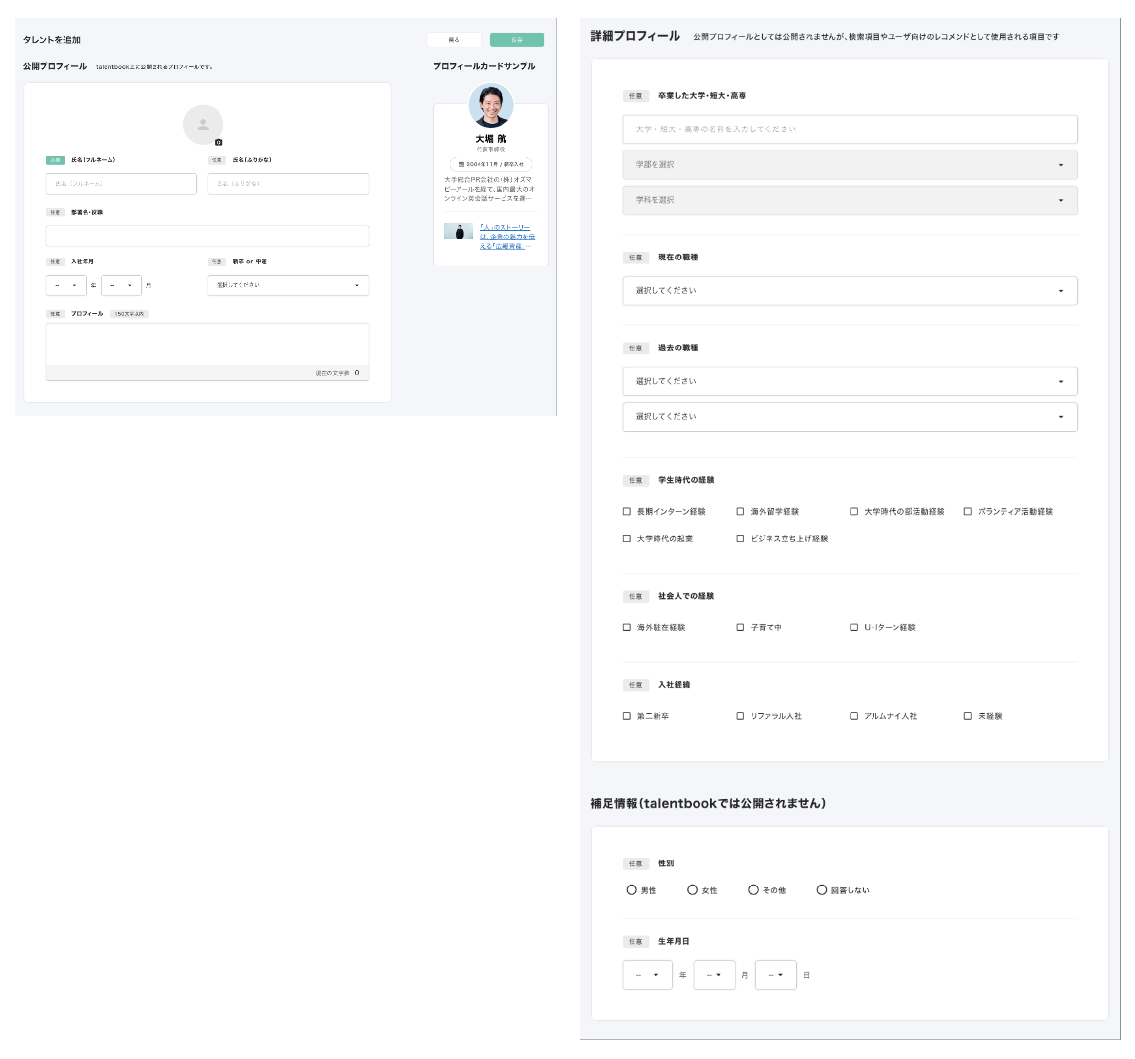 CMS内でのみ確認可能な情報で、talentbookでは公開されない項目です。タレントに関する補足情報を任意で記載いただけます。