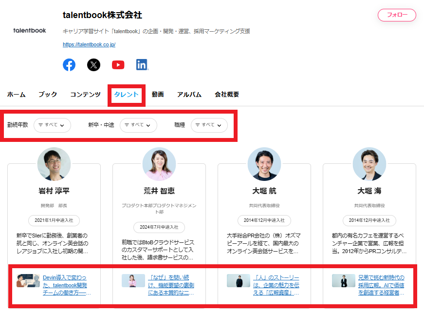 任意項目として、タレント情報に「入社年月」「新卒/中途」「現在の職種」をご設定いただくと、企業ページの「タレント」タブ内で、これらの条件による絞り込み表示が可能になります。