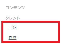 CMSのサイドメニューから「コンテンツ」→「タレント」→新規作成の場合「作成」、編集の場合「一覧」をクリックするとご確認いただけます。