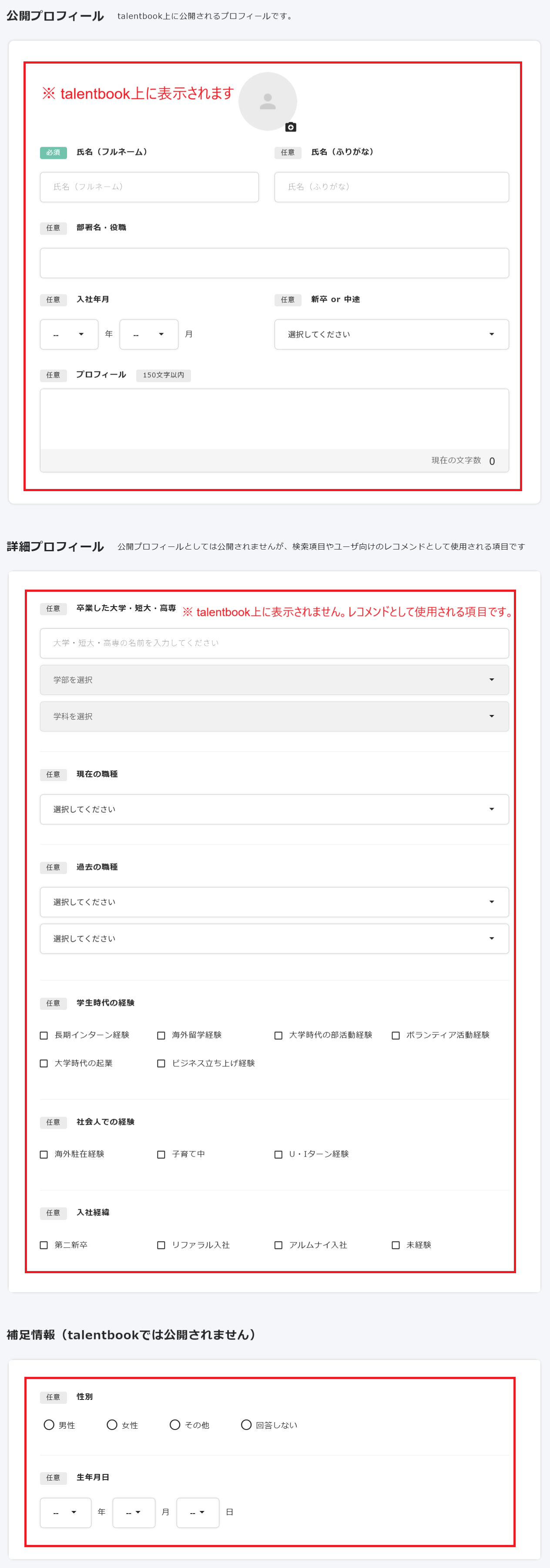 現時点ではtalentbook上に表示されませんが、今後の機能強化に伴い、検索機能や読者へのレコメンドに活用される予定です。将来的に公開される可能性をふまえてご入力ください。