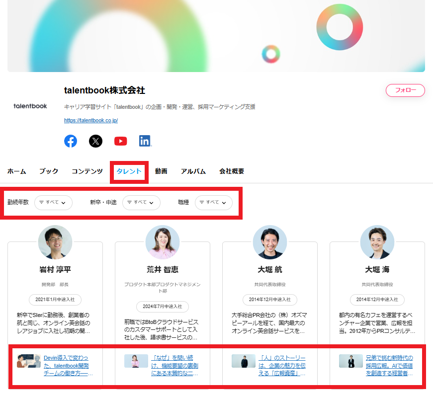 また、2025/6/10に企業ページに「タレント」タブを追加しており、企業ページのTOPに「タレント」タブが表示されるようになりました。