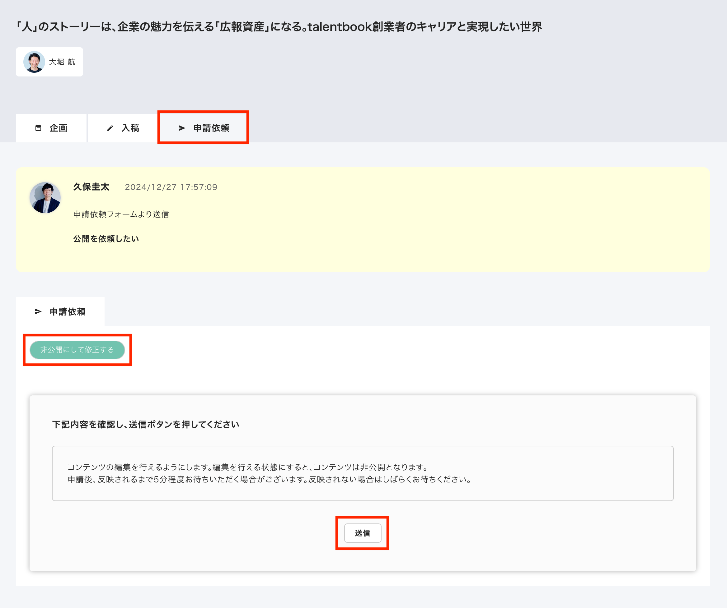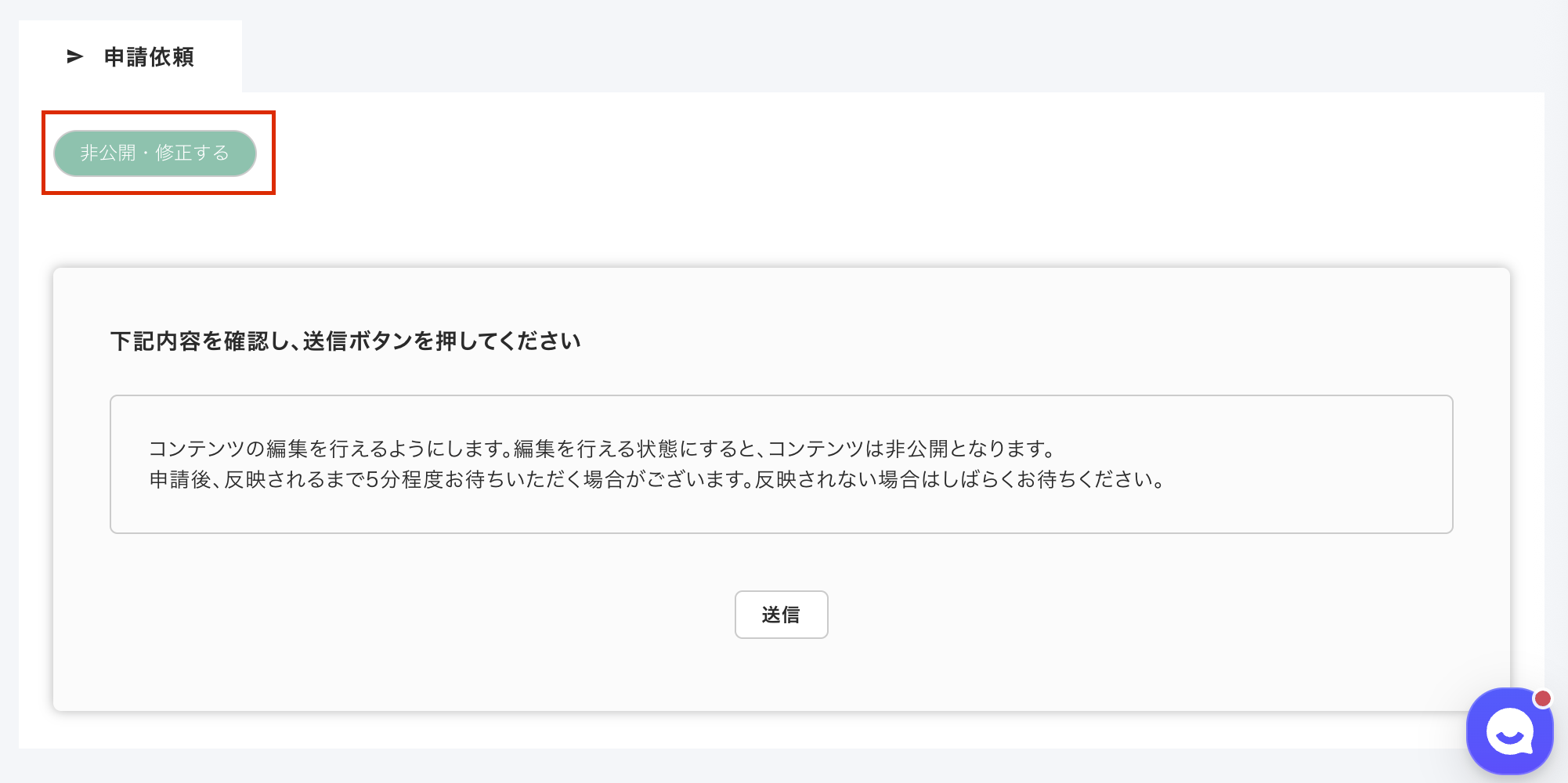 ③「申請依頼」タブを開き、「非公開・修正する」を選択し、内容を確認の上「送信」をクリック