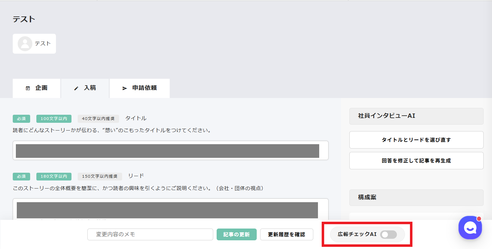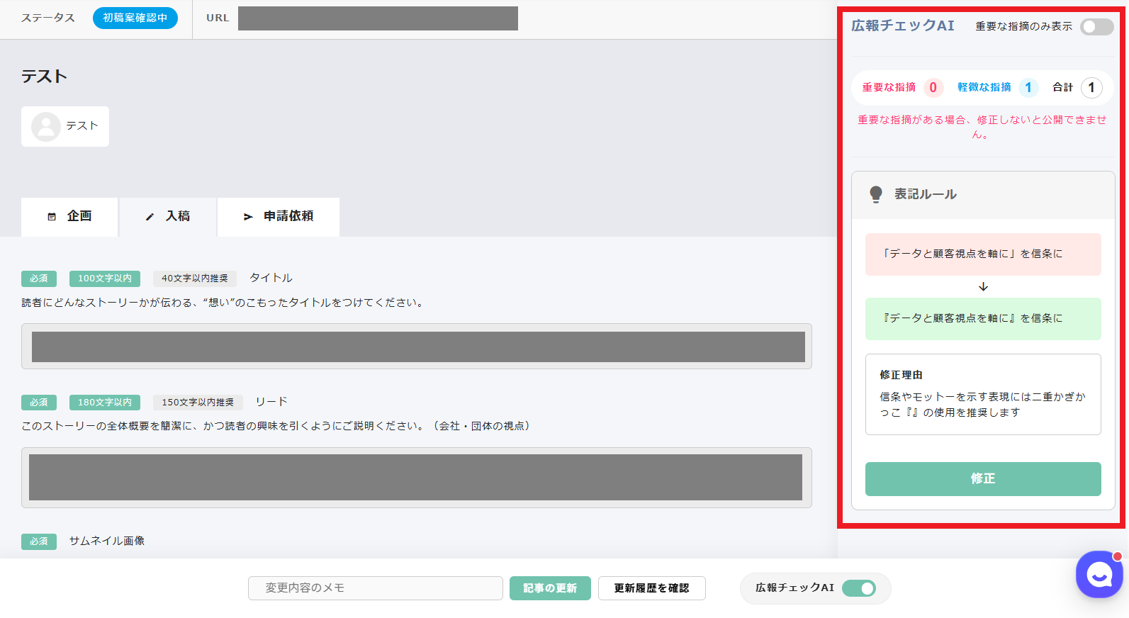 ※ 公開依頼申請時にも広報チェックAIの確認が行われます。「重要な指摘」が残っている場合は修正を促されますので、必ず修正をしてください。