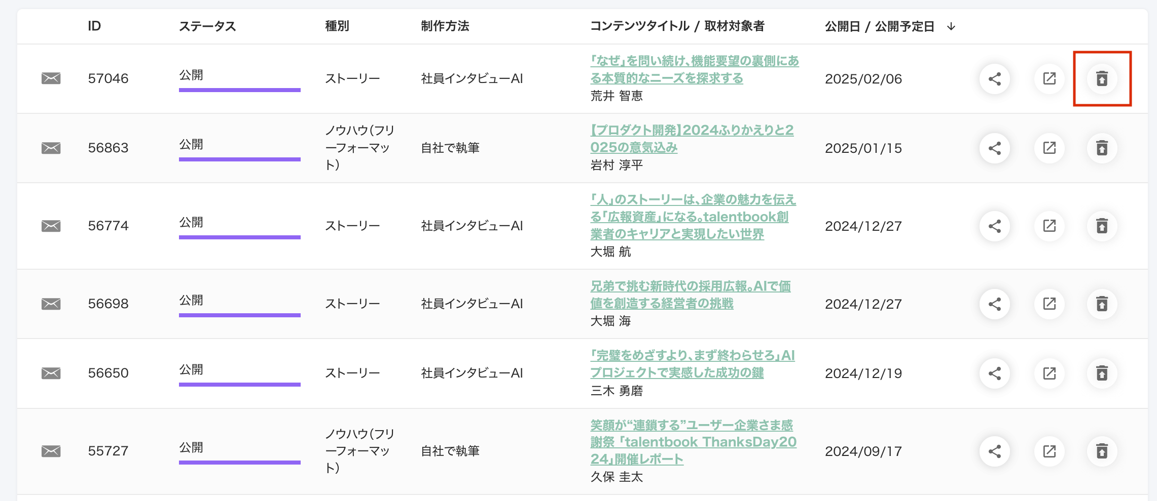※ 全てのコンテンツを削除すると企業ページ自体も非公開となります。