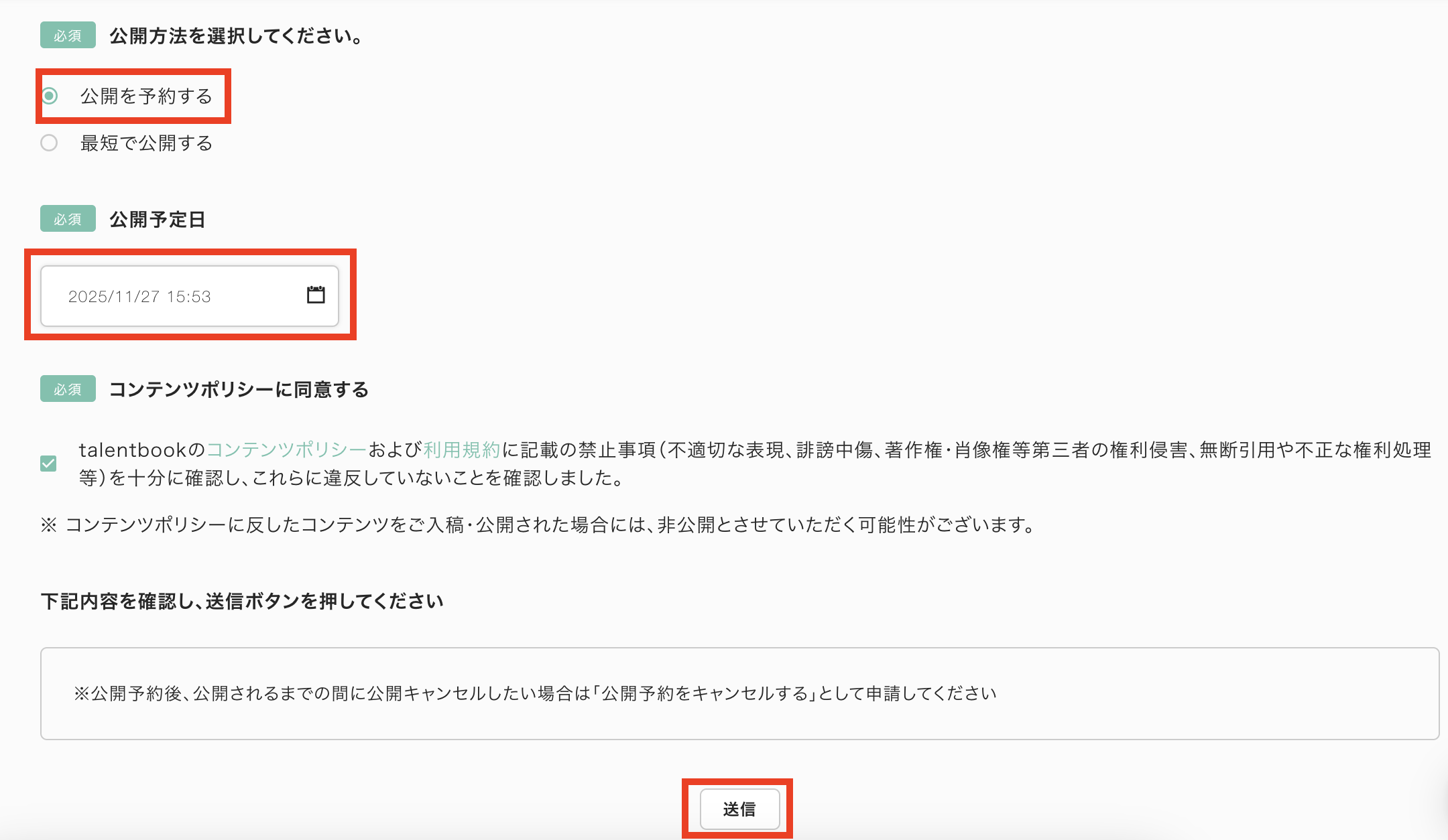 「公開を予約する」を選択し、希望の公開予定日をご指定。問題なければ「送信」をクリックして完了。