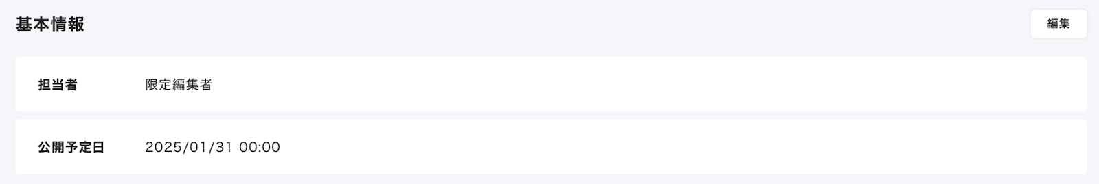 限定編集者は、ご自身のタレント情報(※)、制作担当者に指定されたコンテンツの閲覧・編集のみ可能です。制作担当者に指定されているコンテンツの公開・削除、記事のエクスポートの他、アナリティクスの閲覧など、制作担当者に指定されたコンテンツ編集以外の機能はご利用いただけません。