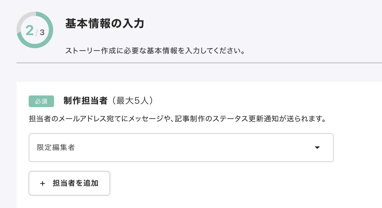 ※ 限定編集者権限ユーザーを制作担当者に指定できるのは「管理責任者・管理者・共同編集者」権限ユーザーのみです。
