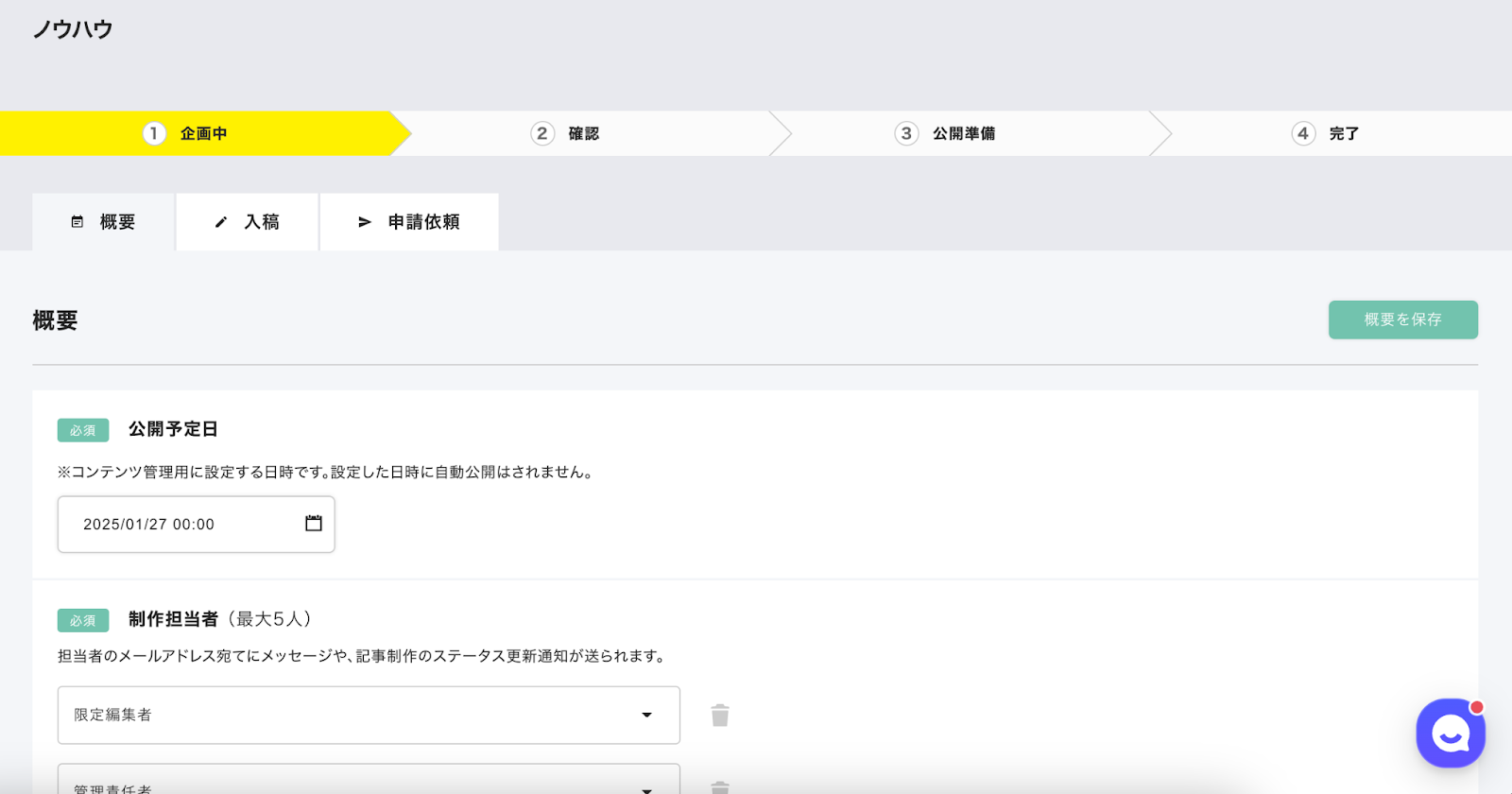 ②制作担当者の項目で、編集を可能としたいユーザーを選び、「概要を保存」をクリック