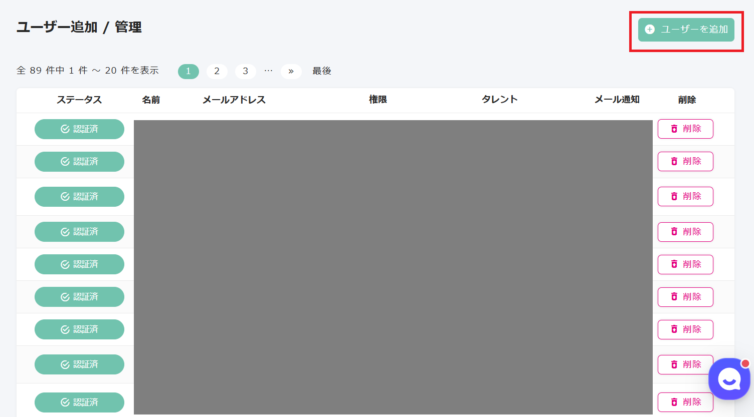 ※ ユーザーを追加するためには、「管理責任者」「管理者」のどちらかの権限が必要です。