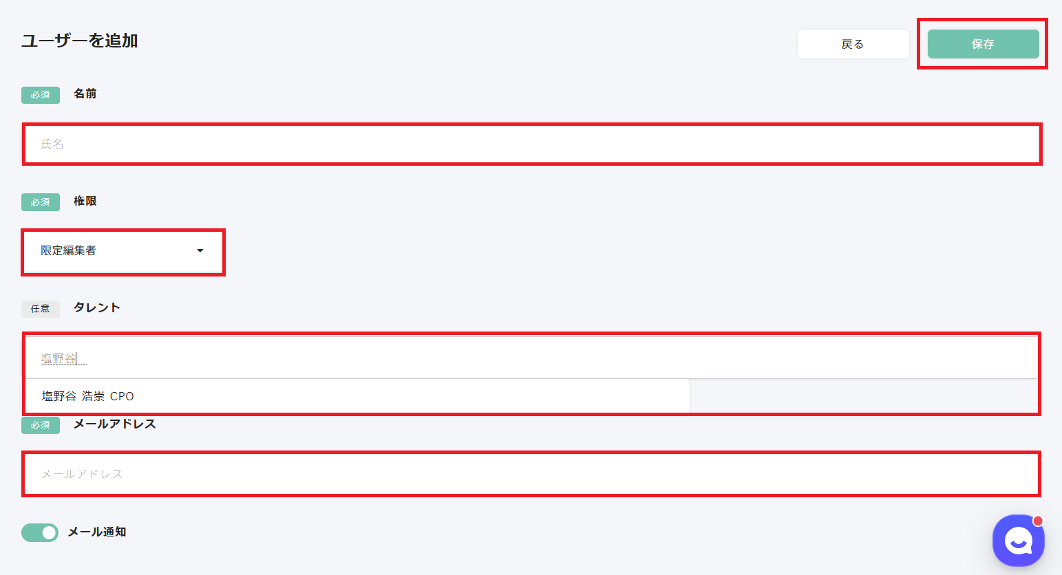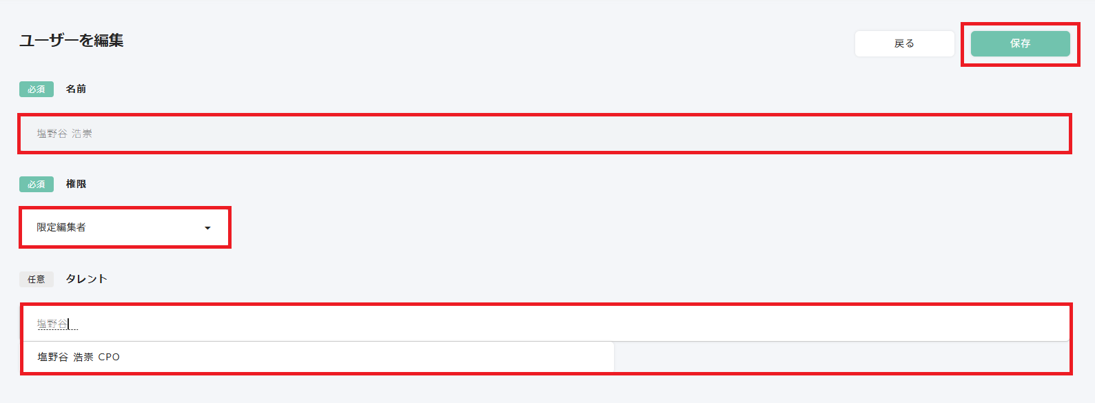 ※ 限定編集者がご自身のタレント情報を編集できるようにするには、「タレント名」の項目で該当のタレントを選択してください。タレントの追加方法はこちらをご参照ください。