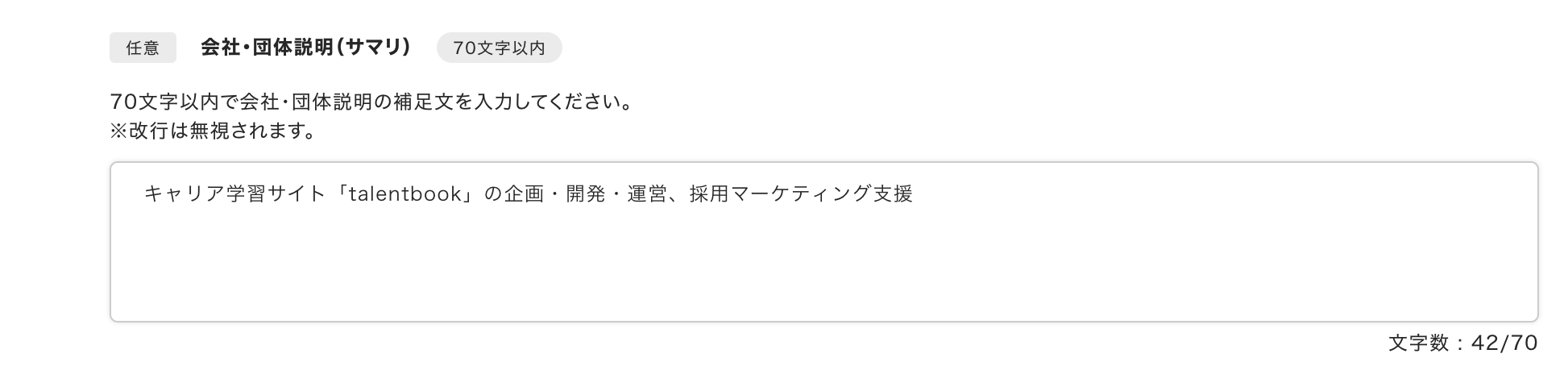 サイドメニュー「企業情報編集」から「企業情報」を選択し、「会社・団体説明(サマリ)」の項目から設定可能です。