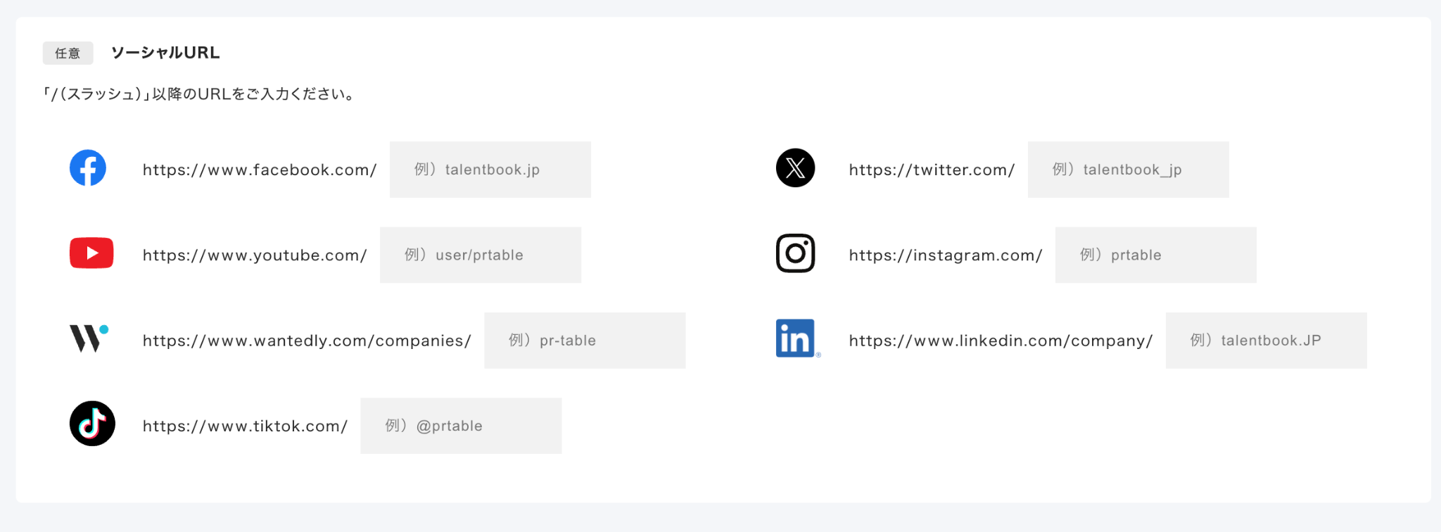 サイドメニュー「企業情報編集」から「企業情報」を選択し、「ソーシャルURL」の項目から設定可能です。設定方法の詳細はこちら。