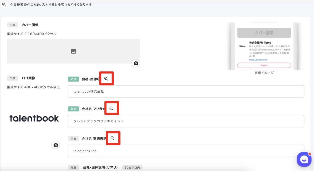 サイドメニュー「企業情報編集」から「企業情報」を選択し、「虫眼鏡マーク」がついた項目に情報を入力することで設定可能です。