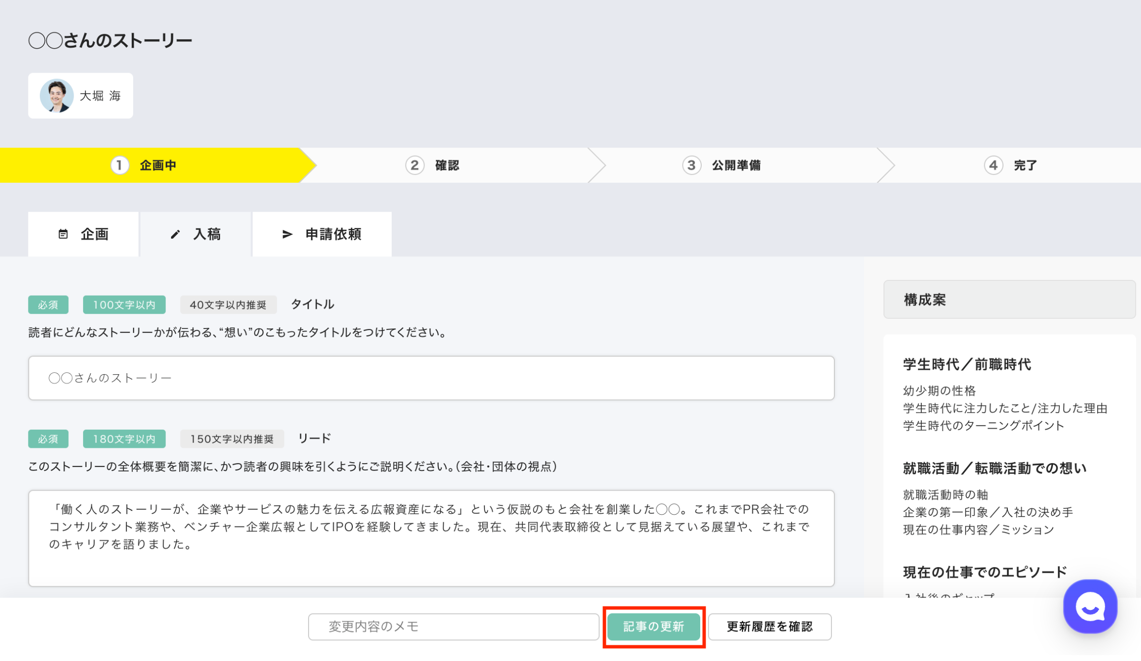 ステータスが「企画中」になったことを確認