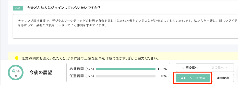 ・4章分の回答を完了し、「ストーリーを生成」ボタンをクリックしたタイミング