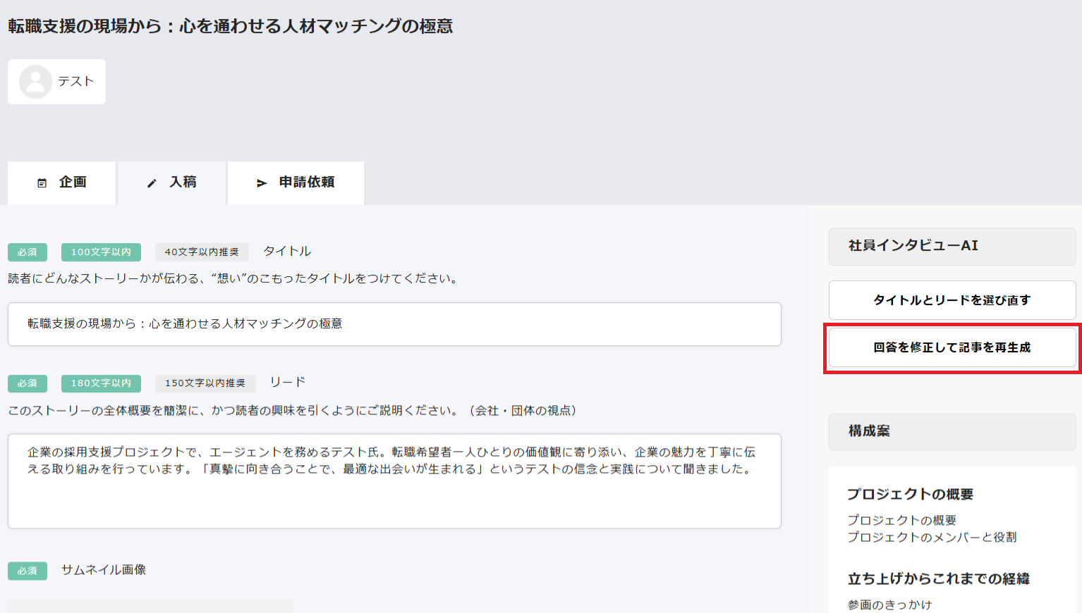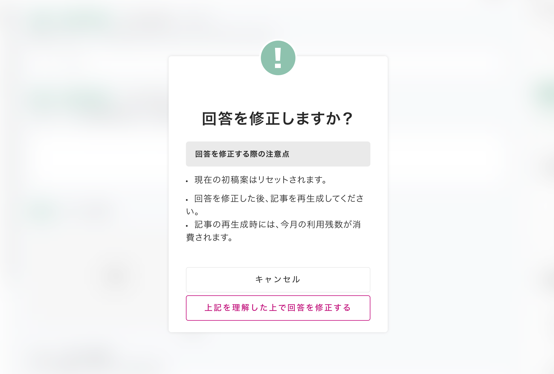 ・入稿画面の「回答を修正して記事を再生成」ボタンから回答を修正し、再度「ストーリーを生成」ボタンをクリックしたタイミング