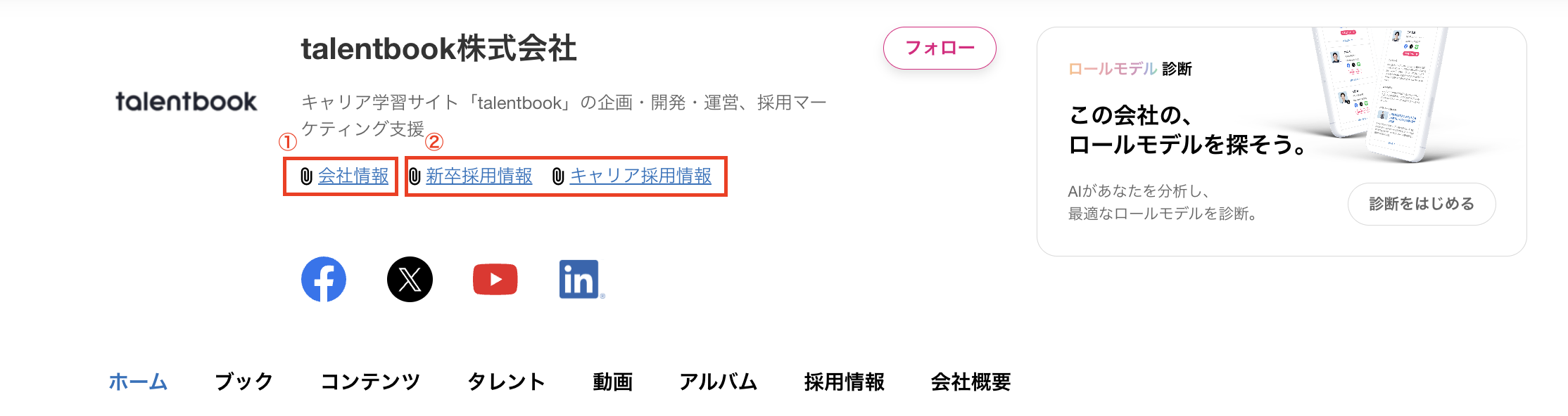 ・「企業情報URL」の隣に、②の採用サイト等のURLを2つまで設定できます