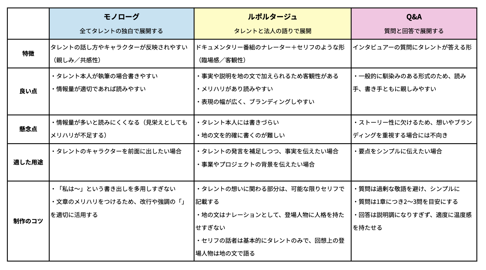 ストーリーの文章形式として「モノローグ」、「ルポルタージュ」、「Q&A」があります。それぞれの特徴と執筆する際のコツをご紹介します。