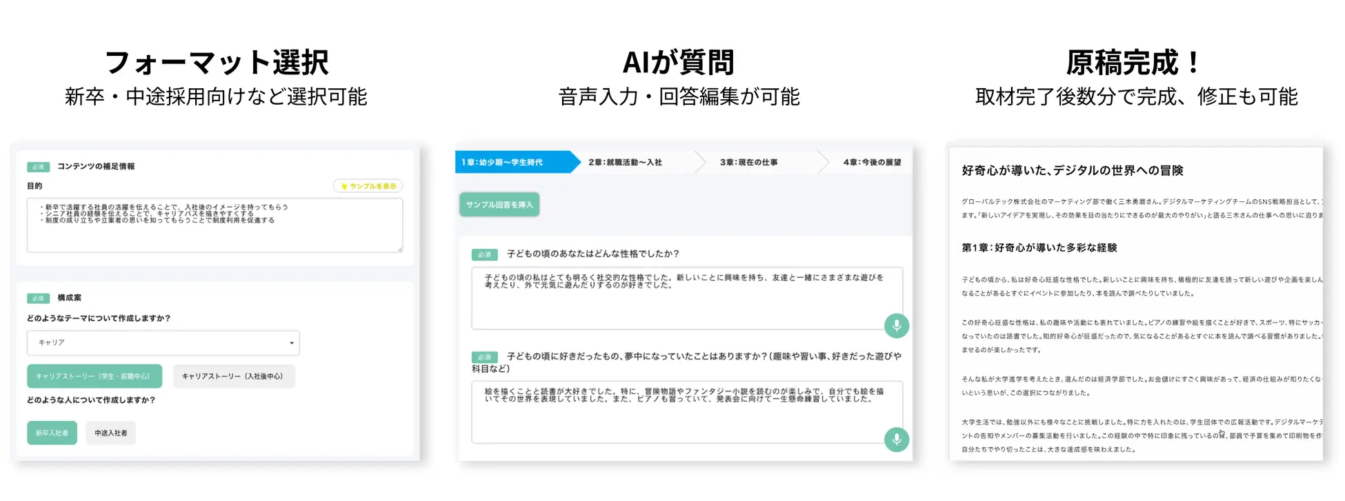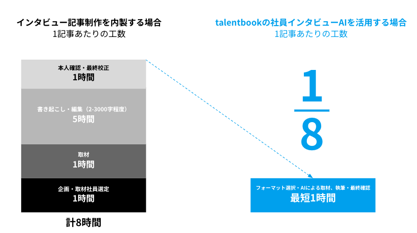 新卒採用やキャリア採用など目的・テーマに沿った質問が導き出され、インタビューから制作までの1記事あたりの工数を従来の1/8に短縮可能となります(当社調べ)。