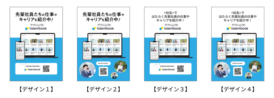 4種類のデザインをご用意しており、Microsoft PowerPointで画像やテキストを自由に編集できます。自社のタレントの写真などに差し替えてご活用ください。