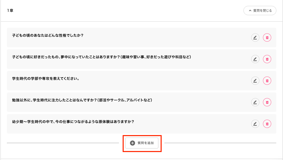 質問の追加:各章の末尾にある「+ 質問を追加」ボタンをクリックし、質問文を入力後、「保存ボタン」をクリックします。