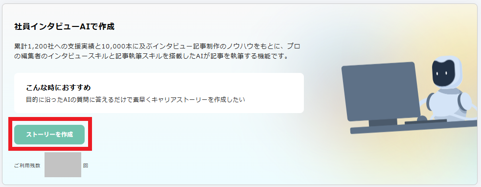 ① サイドメニューから、コンテンツ > 「作成」をクリックし、「社員インタビューAIで作成」から「ストーリーを作成」を選択します。