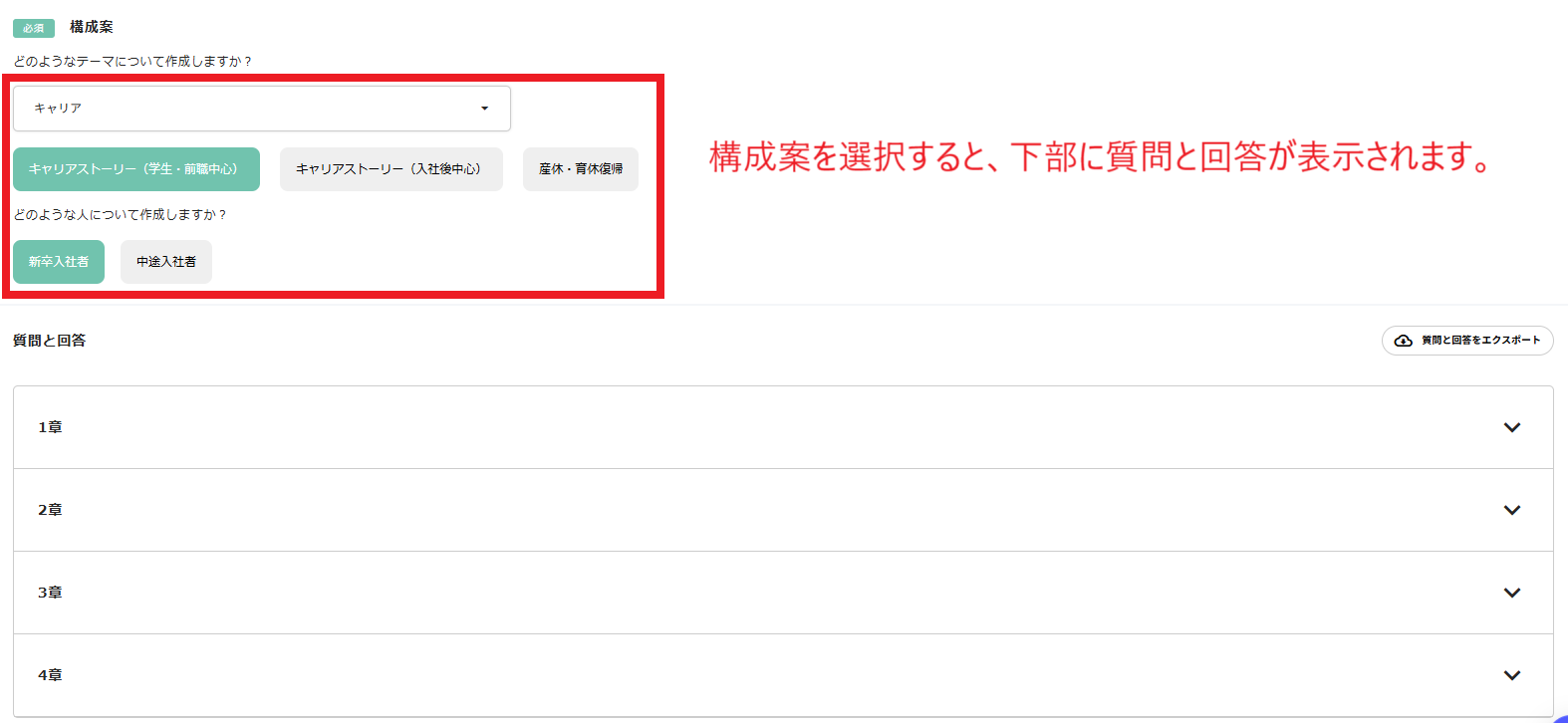 ② 取材対象者や目的などを入力後、「構成案」セクションでテーマ・人を選択すると、下に質問案が表示されます。