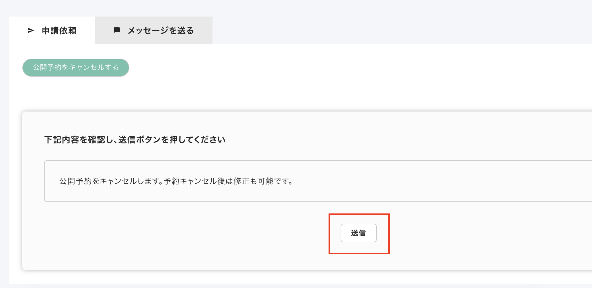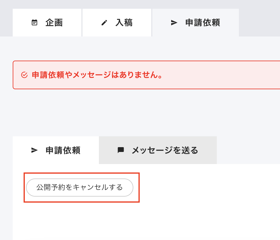 「申請依頼」タブを選択し、「公開予約をキャンセルする」ボタンをクリック