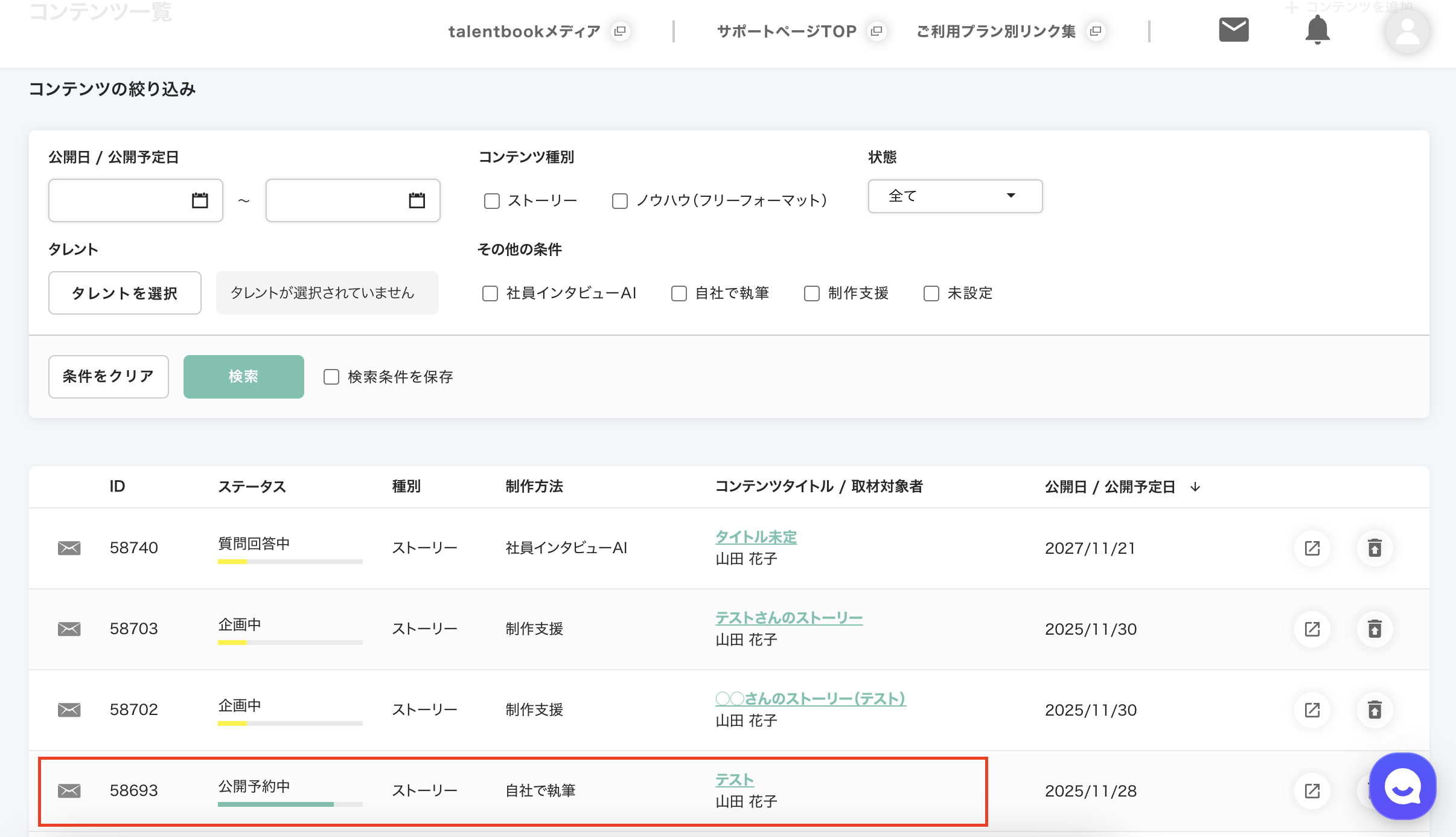 コンテンツ一覧から公開予約をキャンセルしたい「公開予約中」ステータスのコンテンツを選択