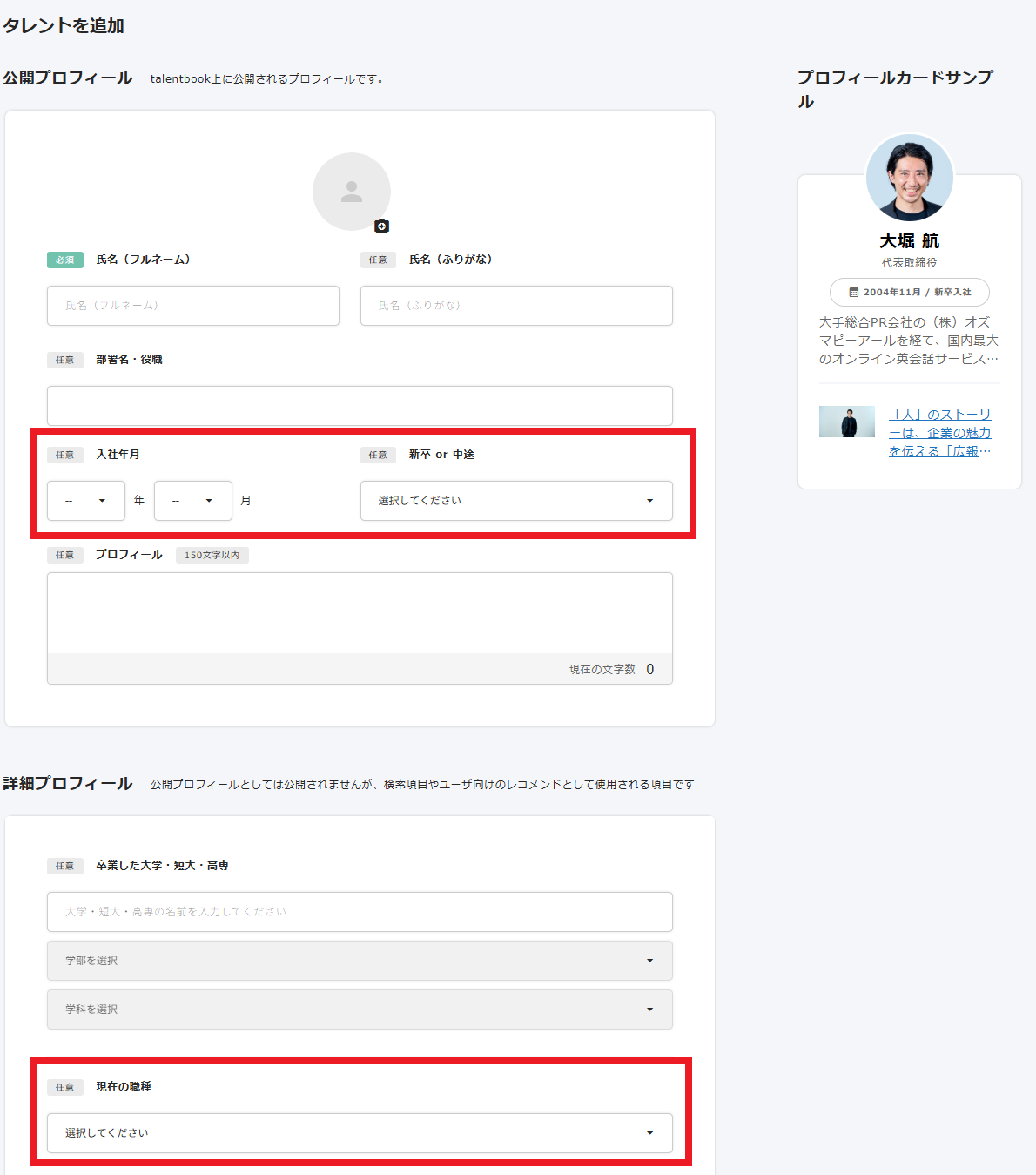 タレント情報に 「入社年月」「新卒・中途」「現在の職種」 のいずれかを必ずご入力ください。※ 未入力の場合、絞り込み条件に表示されません。