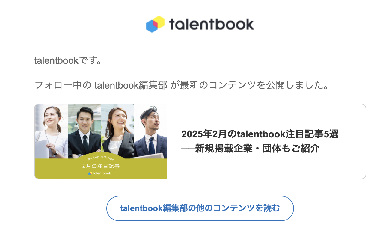 → talentbook編集部の記事内やInstagramで、貴社のコンテンツをご紹介する場合があります。なお、テーマに沿った記事をピックアップしているため、すべてのコンテンツが掲載されるわけではありません。記事での掲載の際には、ポップアップ通知やメールでお知らせします。(※ Instagram掲載時はお知らせはございません)