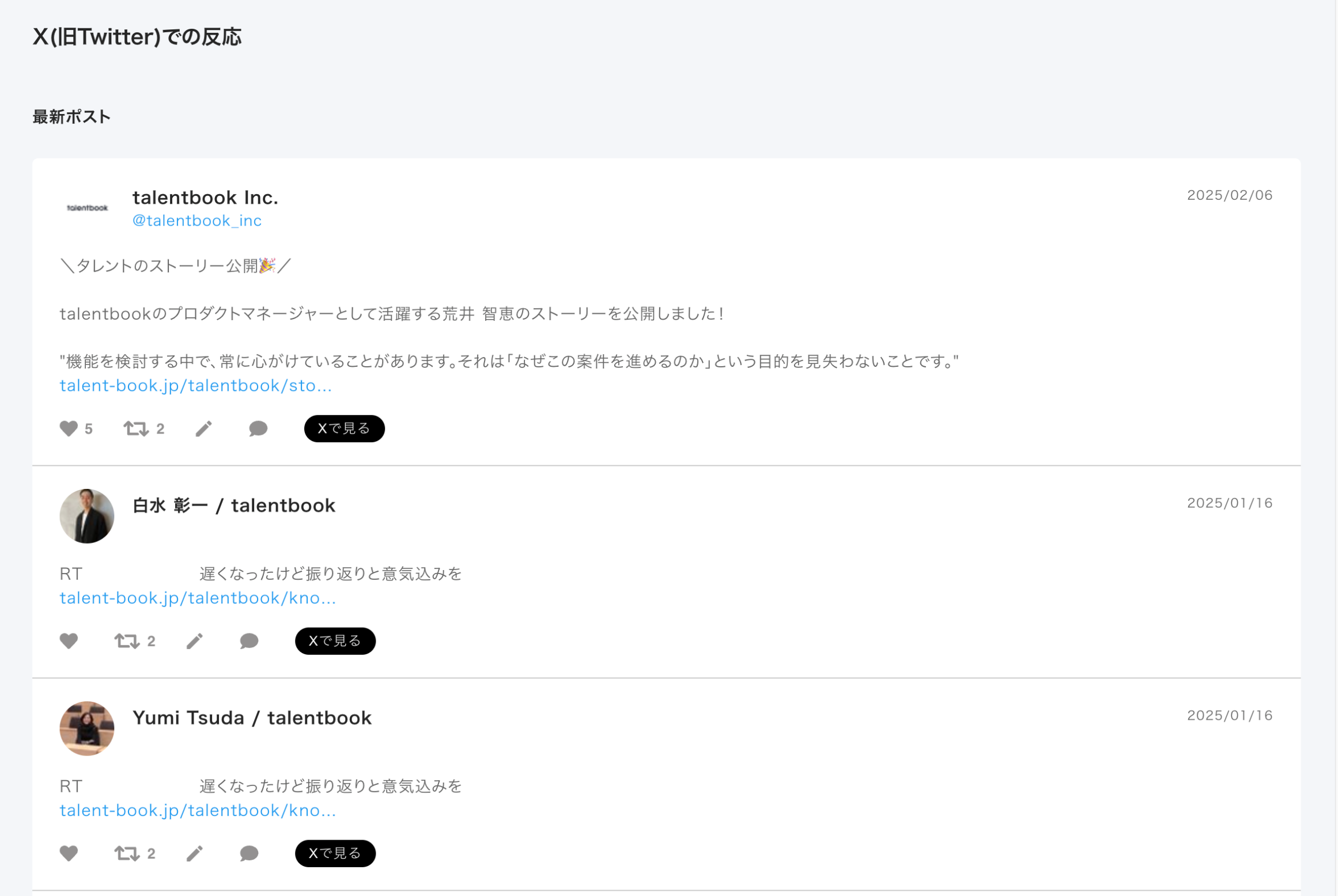 公開したコンテンツの記事URLを含んだポスト、もしくはリポストされたポストが表示されます。